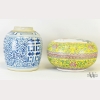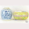 Chinese Porcelain Vase and Covered Box, including a Blue and White Jar and a famille jaune round covered box, the jar without lid, chip to rim, the box appx. 10 7/8 in. DIA.