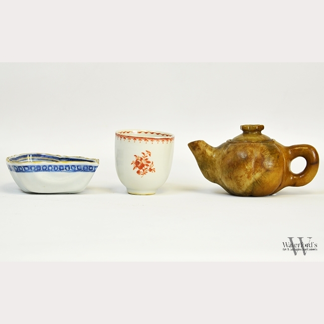 A Group of Three Small Chinese Wares, including a porcelain teacup, a single sweet meat dish, and a stone teapot, the largest appx. 2 3/4 in. H.