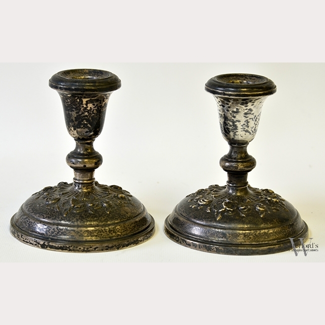 A Pair of Victorian Sterling Silver Candlesticks, decorated in repousse with flowering tendrils to the base, the bases marked Gorham, Sterling, Cement Reinforced, 998, appx. 5 in. H, 4 3/8 in. DIA.
