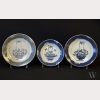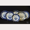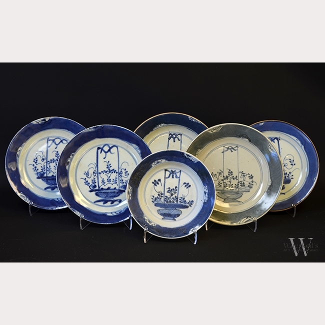 A Set of Chinese Blue and White Porcelain Dishes, including 6 dishes, each with flower filled vase, the smallest with damage to glaze, all with firing flaws, fine chips to rims and feet, appx. 6 3/8 - 7 3/4 in. DIA.