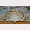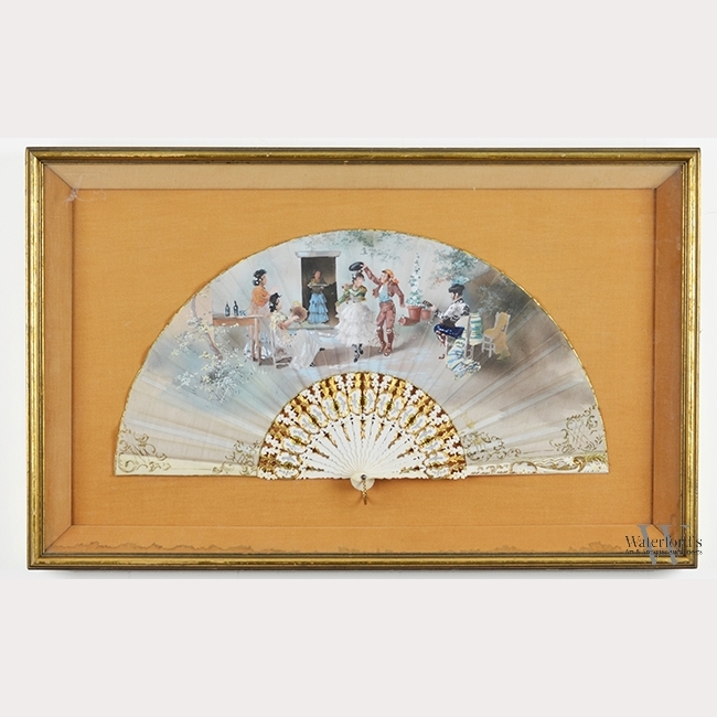 A Continental Painted Hand Fan, the fan leaf painted with Spanish dancers, with gilt resin sticks, in shadow box, appx. 24 1/4 in. W, 15 1/4 in. H.