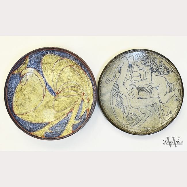 20th Century Continental Studio Ceramic Chargers, including a charger with abstract rooster, and a charger with stylized figures, base with marks and initials, in good condition, appx. 13 1/2 in. DIA.