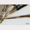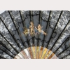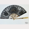An Antique French Painted Lace and Pearl Fan, the black lace leaf with three panels painted with putti and flowers, mounted on mother of pearl sticks, one stick and one guardstick not fixed to lace fan laf, appx. 12 7/8 in. H.