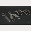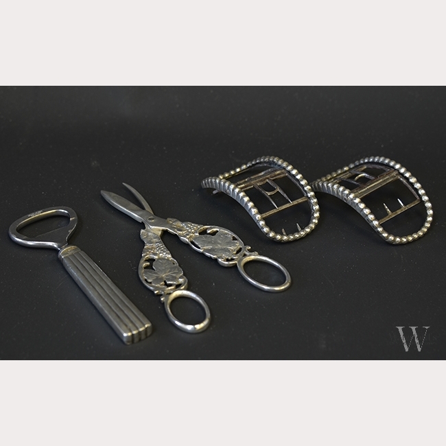 A Group of Continental Silver Objects, including a pair of scissors marked sterling, a bottle opener marked Georg Jensen Denmark with marked sterling handle and stainless steel head, and a pair of beaded shoe buckles, the scissors appx. 5 in. W.