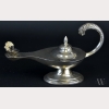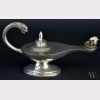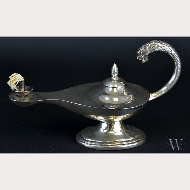 A Small Sterling Silver Oil Lamp/Cigar Lighter, Mexican, the lamp with lion head handle, the underside with SP maker's mark, 925, Hecho en Mexico, appx. 6 in. W.