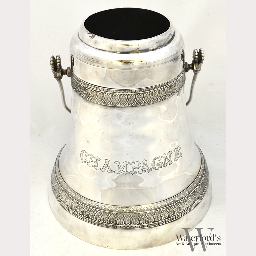 A Silver Plated Champagne Bucket, the bell shaped bucket engraved Champagne between stylized borders around the shoulder and foot, the top removable, the interior hollow for ice, marked 'Simpson Hall Miller & Co Quadruple Plate', appx. 11 1/4 in. H.
