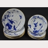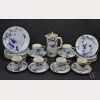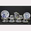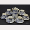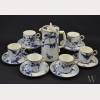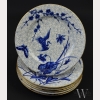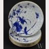 A Late 19th Century Royal Worcester Service, the service for six with a blue and white 'Japonisme' pattern, including dinner plates, side plates, tea cups, saucers and a teapot, the bases marked and most pieces dating to 1883 and 1887, one side plate with hairline cracks to underside, all with wear to gilding and bases, some wear to decoration, the pitcher appx. 8 3/4 in. H, a plate appx. 7 7/8 in. D.