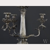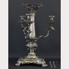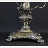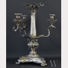A 19th Century Elkington Silver Plated Centerpiece, 1853, the leafy columnar stem supporting three acanthus wrapped arms with candleholders and an open work basket molded with leafy tendrils, supported on a monogrammed tripod base and raised on lion head and acanthus feet, the base with marks, appx. 21 3/4 in. H.