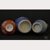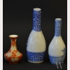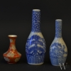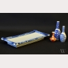 Group of Japanese Miniature Vases and Tray, including two blue and white porcelain vases, a miniature vase with white and gold flowers on red ground, and a blue and white porcelain tray, the vases with fine chips to feet, the tray with hairline crack to foot, the tray appx. 10 3/8 in. W.