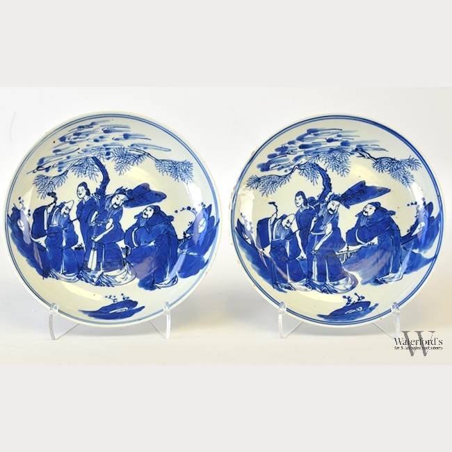 Pair of Chinese Blue and White Dishes, the dishes with underglaze painting in cobalt blue of a group of Chinese figures in a landscape, with Qianlong marks, likely of period, with chips to rim, hairline cracks, firing flaws, appx. 6 7/8 in. DIA.