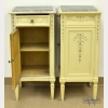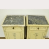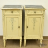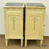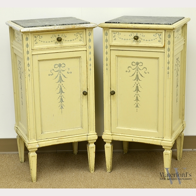 Pair of Late 19th Century Continental Nightstands, French or Italian, the cream painted nightstands with stenciled decoration and green marble tops, with repair to marble, age appropriate wear to stands, appx. 33 5/8 in. H, 16 /8 in. W, 14 1/2 in. D.
