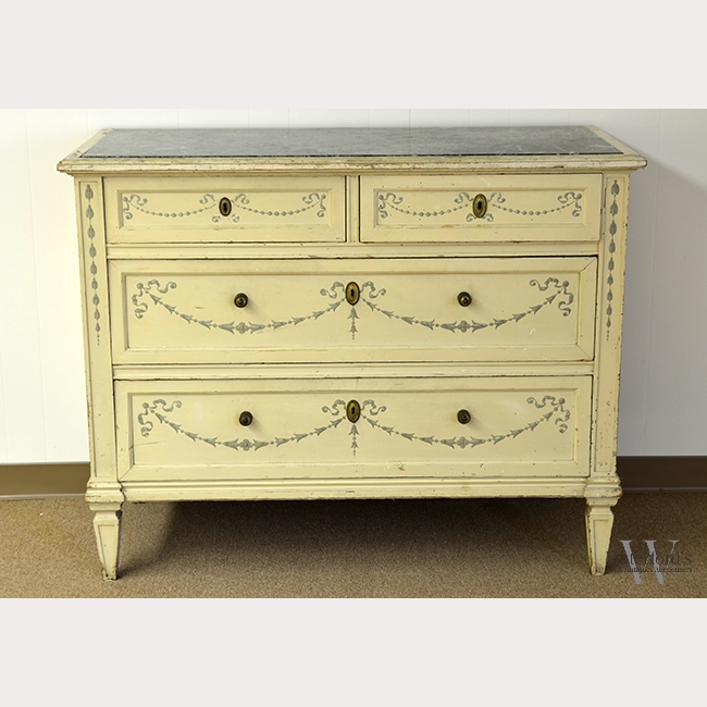 Late 19th Century Continental Painted Wood and Marble Commode, the cream colored commode with mint stenciled decoration and green marble top, appx. 49 1/2 in. W, 23 in. D, 39 in. H.