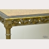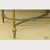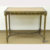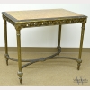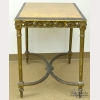 Late 19th Century Italian Marble Top End Table, the table with inset marble top above an open carved apron raised on fluted legs joined by an x-form stretcher, wear to gilt surface, cracks to stretcher, appx. 35 1/2 in. W, 23 1/4 in. D, 29 1/2 in. H.