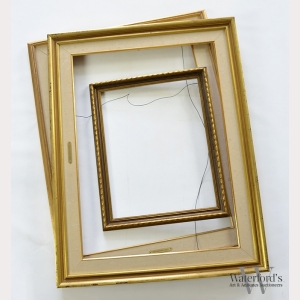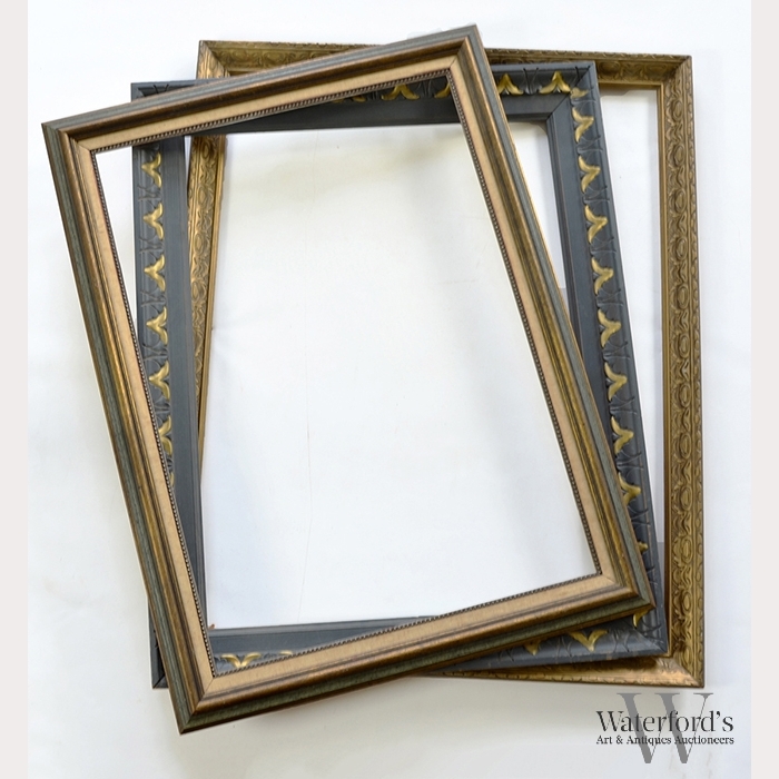 A Group of Six Italian Painted & Gilt Frames, including a black and gold painted frame, with wear to frame, appx. 30 1/4 in. H, 24 in. W; a carved frame painted soft green with gilt borders, with linen matte to the inside, with wear to frame, appx. 30 3/4 in. H, 23 in. W; a painted frame with carved decoration, with wear to frame, appx. 32 1/2 in. W, 26 1/4 in. H; a gilt frame, appx. 20 1/8 in. H, 16 1/8 in. W; a gilt frame with linen matte to interior, mounted with plaque for Carlantonio Longi, appx. 34 in. W, 26 in. H; and a gilt frame with beaded border and linen matte, with plaque for Carlantonio Longi, appx. 25 7/8 in. W, 33 3/4 in. H, all in antique condition.