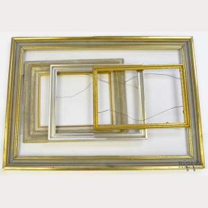 A Group of Four Italian Gilt Frames, including a painted frame, appx. 25 1/2 in. H, 33 in. W; flat gilt frame with plaque for 'T.E.' Castaldo', appx. 16 in. H, 20 3/4 in. W; a gilt and silvered frame, appx. 15 1/4 in. W, 21 in. H; and a gilt frame, appx. 20 1/4 in. H, 13 3/4 in. W, all in antique condition.