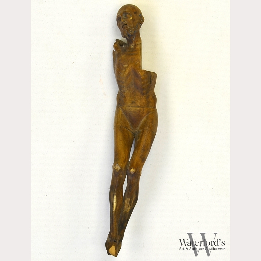 A 17th C. Italian Boxwood & Ivory Anatomical Model, the finely carved model of a nude man with open mouth and upward facing eyes, the cheek, knee and shin with ivory 'bone' inserts, with damage, missing ivory, appx. 11 1/2 in. H.