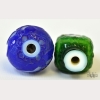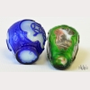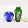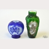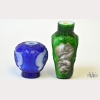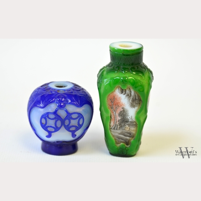 A Pair of Chinese Peking Glass Snuff Bottles, one carved through blue overlay to a milky white ground, the other carved through green overlay to a white ground painted with landscapes, both without tops, the green bottle with small chip to body, the largest appx. 2 5/8 in. H.