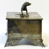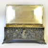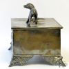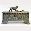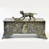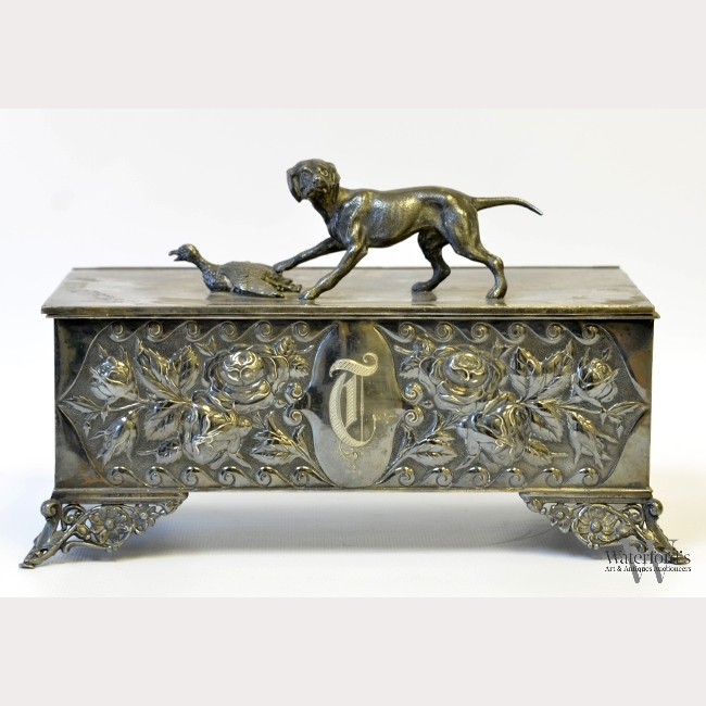 A Victorian Hartford Silver Plated Tobacco Humidor, decorated in repouss� with roses to the front and back, monogrammed to the front, the top with a hunting dog and fowl finial, the base marked Hartford Silver Plate Quadruple Plate, 0509, appx. 9 in. W, 5 in. D, 5 5/8 in. H.