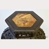 A 20th Century Chinese Marble Top Plant Stand, the hexagonal top with inset marble, raised on six carved and shaped legs joined by a pierced apron and stretcher, with splitting to top, chips and surface wear to body, appx. 31 3/4 in. H, 16 1/2 in. W.