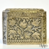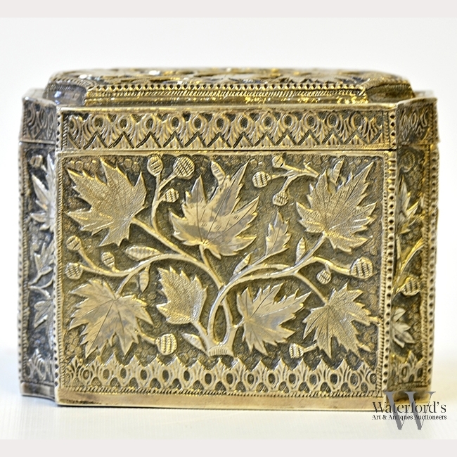 A 19th C. Middle Eastern Silver Tea Caddy, the shaped tea caddy carved with leaves to each side, without marks, the silver tested, weighs appx. 9.3 troy ounces, appx. 3 1/4 in. H, 4 1/4 in. W, 3 in. H.