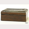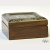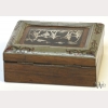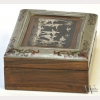 A Continental Wood and Boulle Work Box, the top with boulle work panel of silver pastoral scene set in a tortoiseshell panel on wood carcass, with metal border inlaid with bronze and tortoiseshell tendrils to each corner, with minor chips and damage to top, some warping, appx. 4 1/2 in. W, 3 5/8 in. D, 2 in. H.