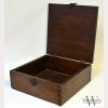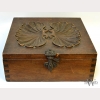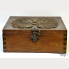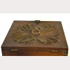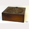 An English Oak Decorative Box, the large box carved with a pair of shells to the top, with shaped metal hinge, with surface wear, scratches, minor gouge to edge, appx. 13 3/4 in. D, 14 in. W, 5 1/4 in. H.