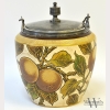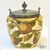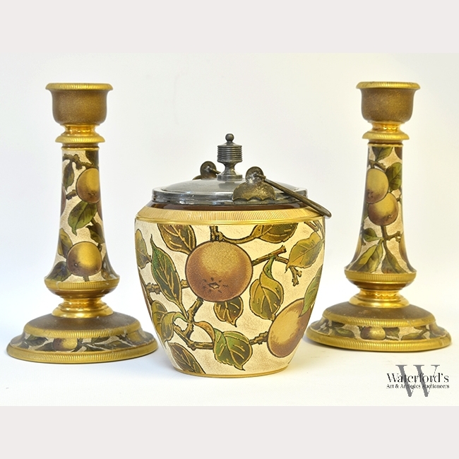 English Staffordshire Candlesticks & Biscuit Jar, the ceramics painted with fruit bearing orange branches, with surface wear, with marks for Taylor, Tunnicliffe & Co., the candlesticks appx. 9 in. H.