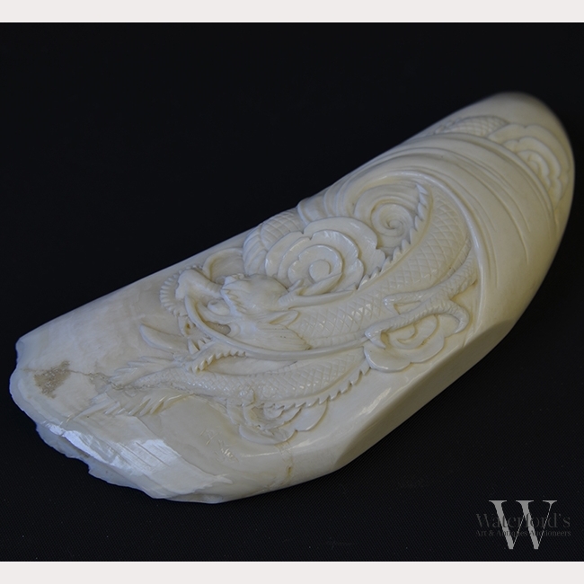 19th Century Japanese Carved Ivory Whale Tooth, carved with a dragon, with crack to lower portion, with glue to base, the largest appx. 6 in. W.