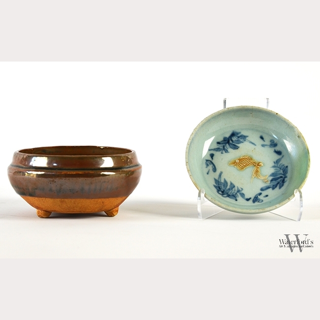 A Korean Porcelain Dish and Censer, the blue glazed dish with repair to rim, the censer appx. 5 in. DIA, 2 1/2 in. H.