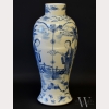 A 19th Century Chinese Blue and White Vase, the vase painted in underglaze blue with panels containing figures in a landscape, the panels divided by bats suspending endless knots, the base with underglaze blue Kangxi marks, with firing flaws, chip to foot ring, appx. 12 in. H.