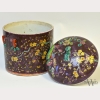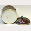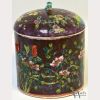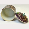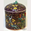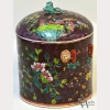 Mid 20th-Century Chinese Export Covered Jar, the cylindrical jar decorated with a bird on flowering prunus branches on a purple ground, mounted with a pair of raised and pierced flange handles at each side, one flange accompanied by a calligraphic seal and carved inscription, the domed top similarly decorated and mounted with an animal finial, the base with four character mark, with wear to surface and foot, appx. 9 3/4 in. H, 7 1/2 in. DIA.