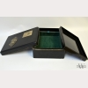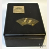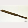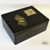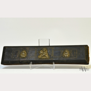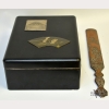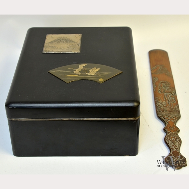 A Japanese Lacquered Box and Carved Page Turner, the lacquered box set with two carved metal plaques to the top, the interior with two trays, the page turner carved and with inscription, the box with wear, damage to metal rims, the page turner clipped at the handle, with wear throughout, the box appx. 9 in. W, 11 3/4 in. D, 4 1/2 in. H.