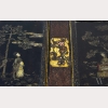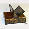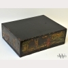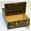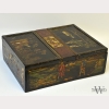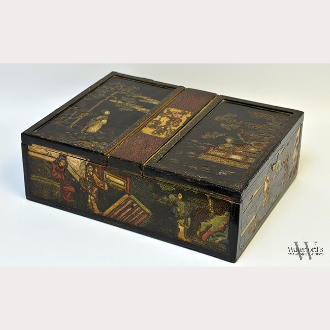A Chinese Carved Lacquer Box, the top with two doors each carved and painted to the top with a woman below a leafy tree, with inscriptions to the interior, the sides of the box carved and painted with scenes of Chinese life, the double sided wood interior left unstained on one side, with wear to surface, damage to sides of top and bottom edge, appx. 12 1/2 in. W, 9 5/8 in. D, 4 3/8 in. H.