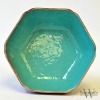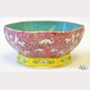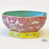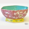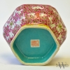 A Republic Period Chinese Famille Rose Bowl, the hexagonal bowl enameled to the exterior with panels containing bats and lotus flowers on a pink ground meander, raised on a high foot, the interior and base with turquoise glaze, the base with Qianlong marks, with chips to mouth, appx. 5 1/4 in. W, 2 1/2 in. H.
