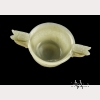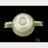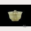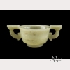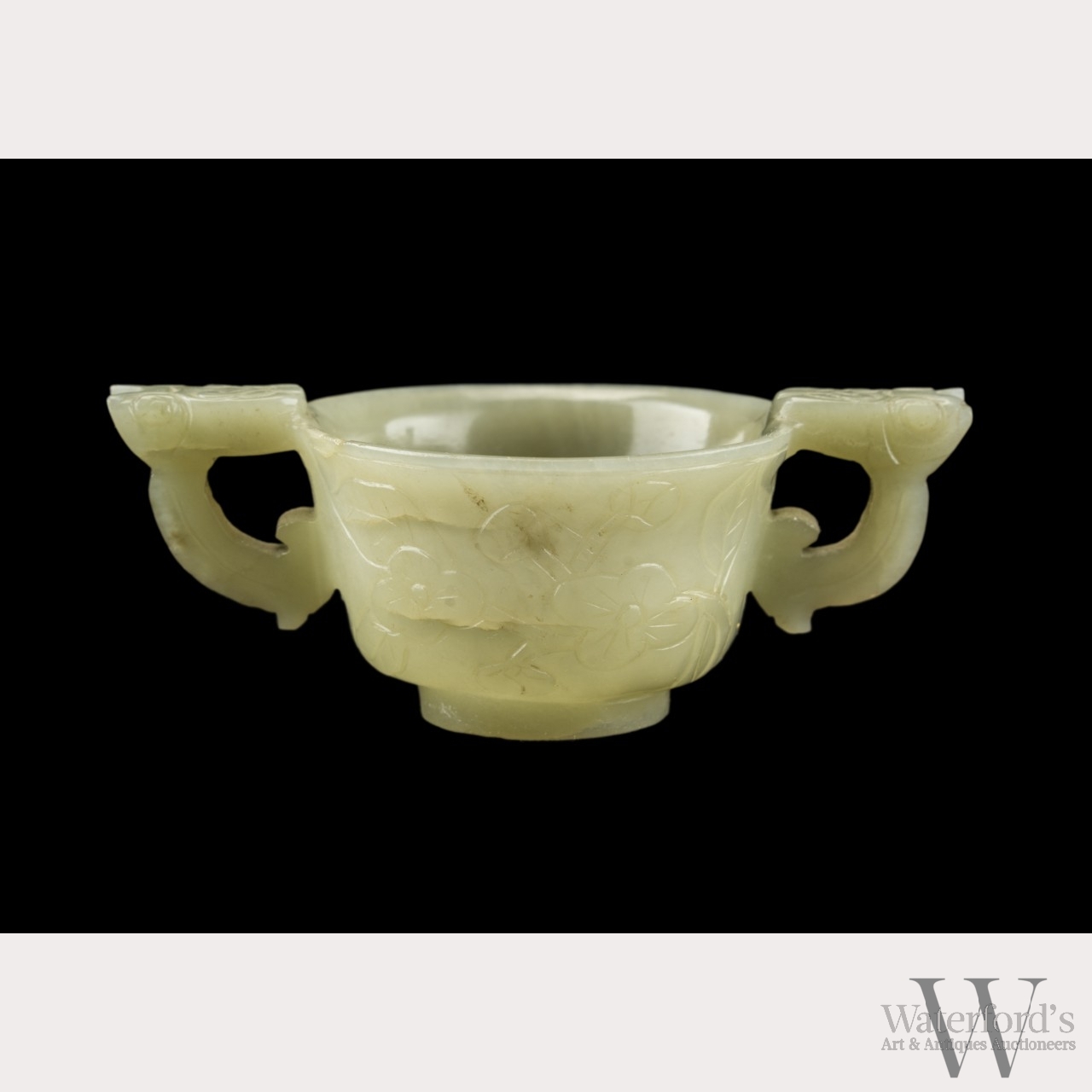 The ceremonial cup on a foot ring with two opposing dragon handles, the body of the cup decorated with plum blossoms carved in relief. The stone a semi-translucent celadon green with natural veins and inclusions. Approx. 1 3/8 by 4 in., 3.5 by 10.2 cm.