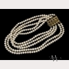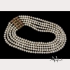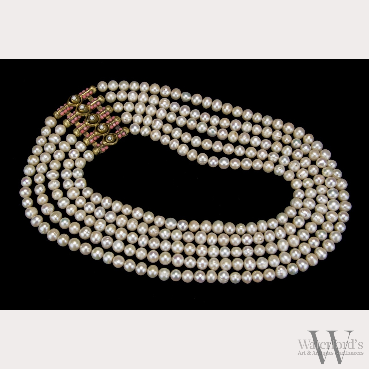 20th century. Five graduated strands of light gold large potato pearls, each pearl approximately 10 mm in size. The strands graduate from 18 to 28 inches in length with 42, 49, 56, 62, and 69 pearls per strand. The wide five-prong gilt bronze clasp set with five pearls and 58 pink coral faceted cabochons. Approx. 2 3/8 by 28 in., 6.1 by 71.2 cm.