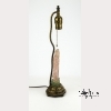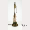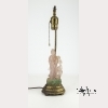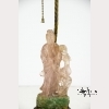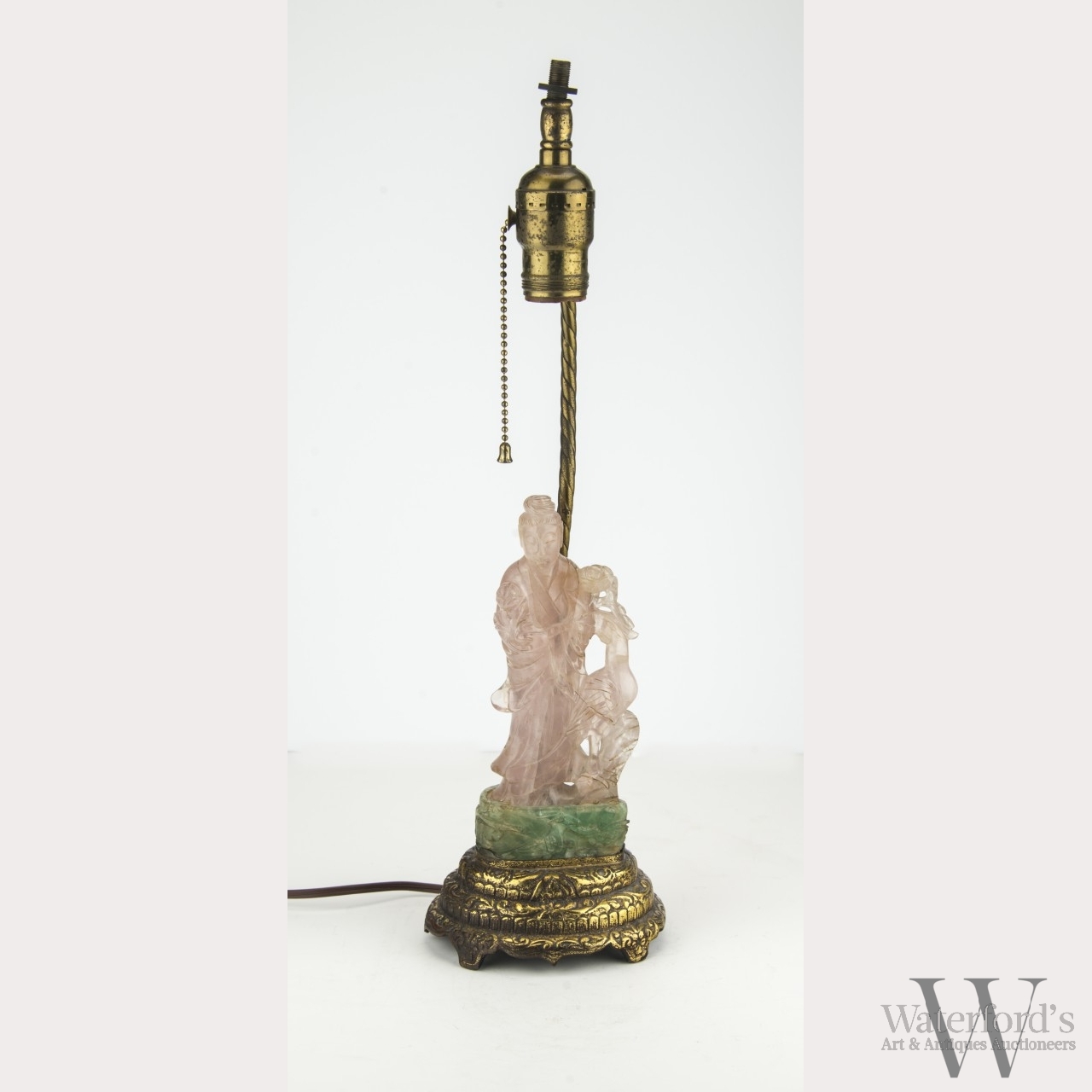 A rose quartz carving of the bodhisattva of mercy, Guanyin, who stands wearing long draping robes and holding a lotus flower. Next to the deity is a phoenix, also with a lotus flower in its mouth. On a base of green aventurine carved with more birds and flowers. Mounted as a lamp on gilt bronze and brass hardware. The quartz approx. 7 1/4 by 3 in., 18.4 by 7.6 cm.