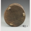 19th century, Qing dynasty. The bamboo bitong carved to depict Shoulao, the Daoist god of longevity, holding a giant peach over his shoulder and accompanied by an attendant in a grove of pine trees. With dark wood mounts and tripod feet. Approx. 5 3/4 by 4 1/2 cm.