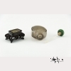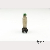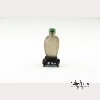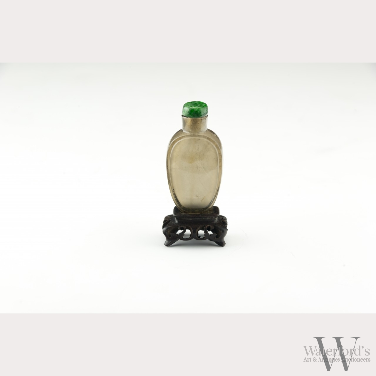 Late 19th century, Qing dynasty. The flattened ovoid snuff bottle with pronounced sides on an oval footring, well hollowed, with jadeite stopper, bone spoon and wooden stand. The bottle approx. 2 1/2 by 1 1/8 in., 6.5 by 3 cm.
