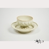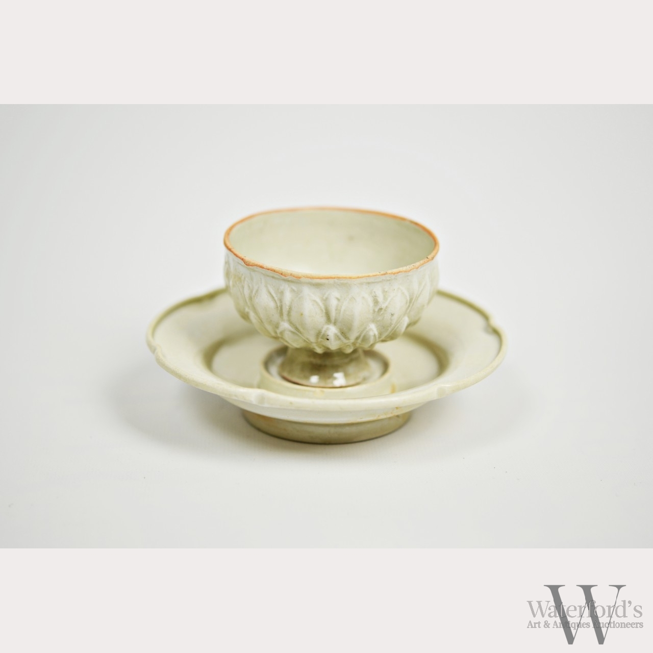 Song Dynasty (960-1279). The small bowl-shaped cup on a tall flaring foot ring with a molded lotus petal exterior, covered all over in a white glaze with a slight green tinge pooling in the recesses, mouth rim unglazed. The cup stand with raised central ring, flaring sides, hexalobed rim, on a tall flaring foot ring, covered in glaze to match cup. Provenance: Ex-collection of Robert H. Ellsworth, previously sold at Skinner's Sale 2528B on December 3, 2010, lot #1111. Cup approx. 2 1/8 by 3 1/8 in. diam., 5.5 by 8 cm. diam. Stand approx. 1 � by 5 � in. diam., 3.2 by 13.4 cm. diam.