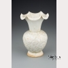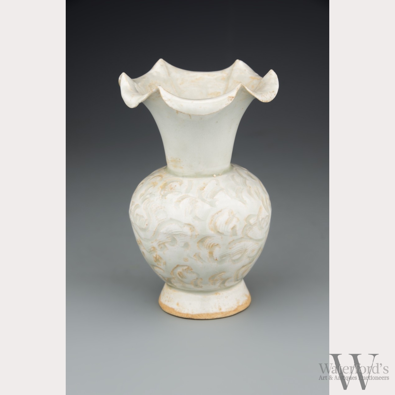 10th- 12th century, Song dynasty (960-1279). The globular vase on a tall everted foot ring and trumpet neck with flared foliate rim, freely incised and combed floral meander around body, covered in a translucent glaze with a blue tinge. Approx. 6 by 4 in., 5.3 by 10.2 cm.