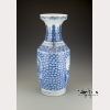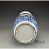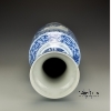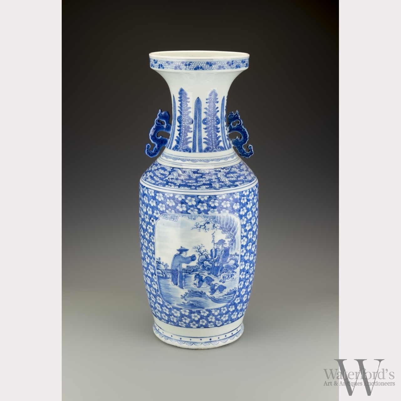 19th century, Qing dynasty. A tall porcelain baluster vase decorated in cobalt blue underglaze to depict two framed similar scenes of an old man touching his ear accompanied by three rams. The scene is from The Zhuangzi, a warring states collection of Daoist fables and anecdotes, where leading the life of a recluse is desirable. Here, Zhuangzi is cleaning his ears to forget the words of an official who wants to employ him. In addition the depiction of the three rams creates the rebus, ?san yang kai tai? or ?three rams portend a bright future.? The scenes surrounded by prunus and cracked ice pattern, leading up to scrolling clouds and bats encircling the shoulder, banana leaf and floral lappets around the tall flaring neck, straight rim also decorated with prunus and cracked ice. Opposing chilong dragon handles on opposite sides of the neck. Unmarked base. Approx. 24 1/4 by 10 in., 61.5 by 25.5 cm.