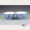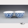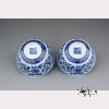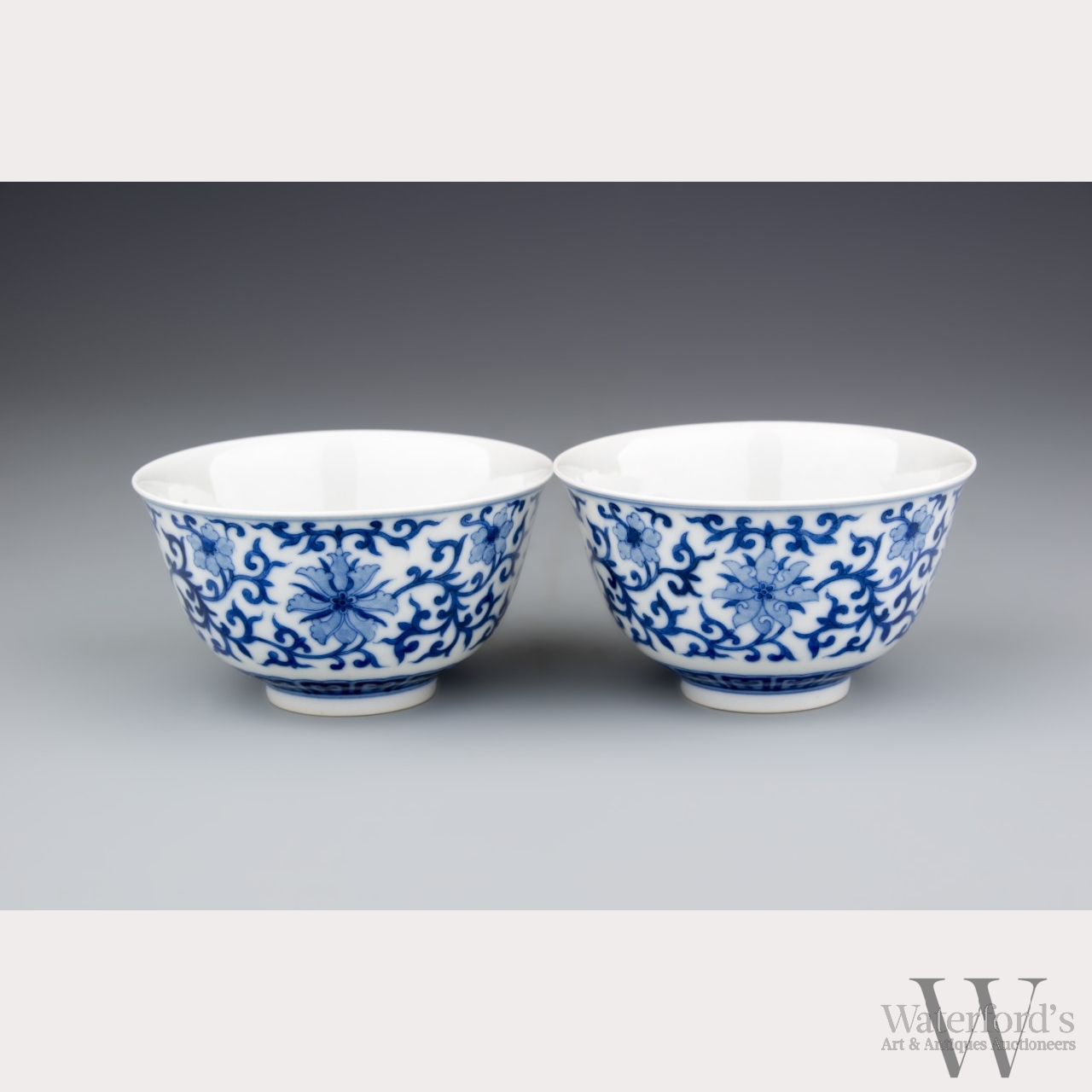 A petite pair of round bowls on tall foot rings with a gently outturned rim, decorated in underglaze blue lotus flower meander above lappets encircling the foot ring. Six character underglaze blue zhuanshu Qianlong mark to bases. Approx. 2 by 3 5/8 in., 5.1 by 9.2 cm.