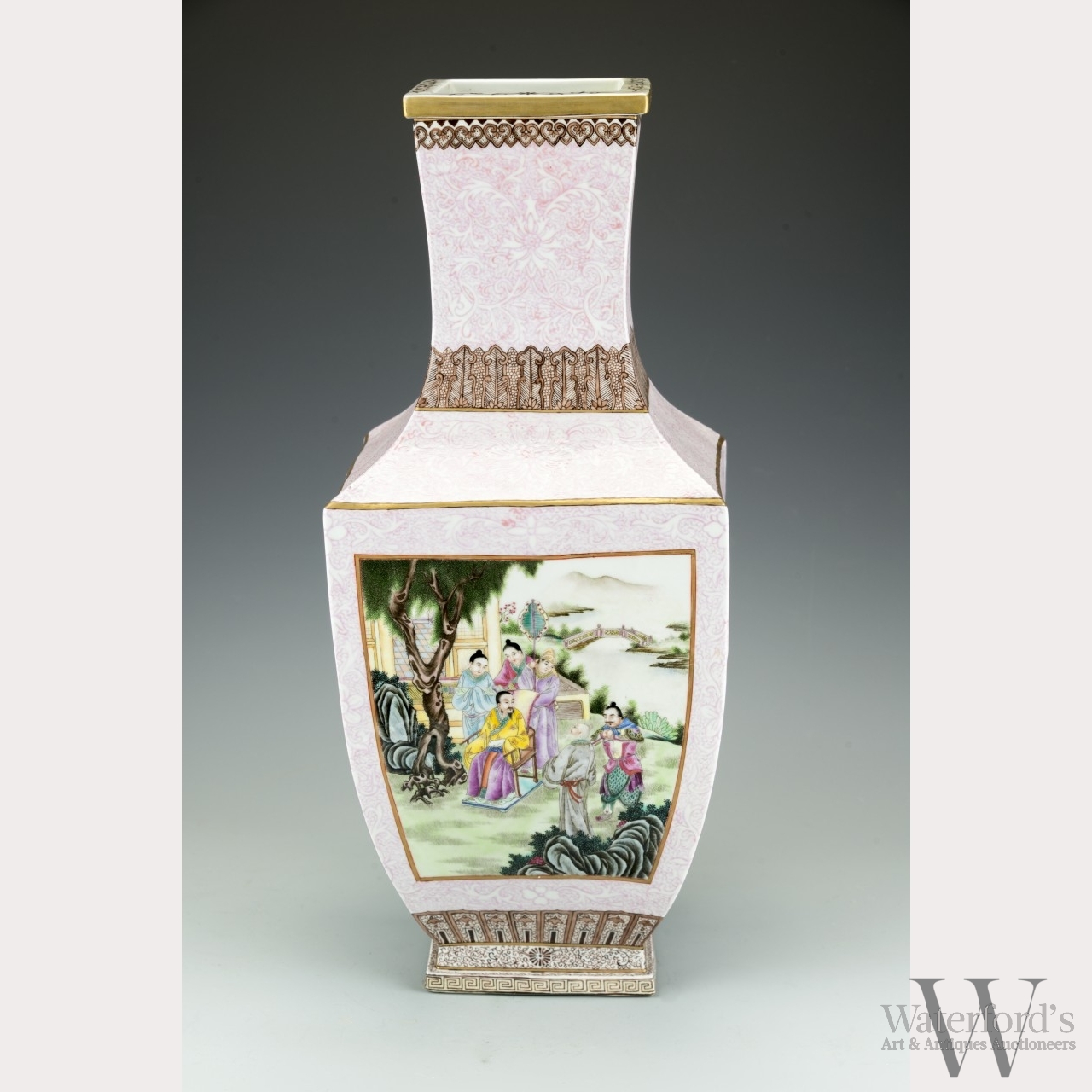 19th/20th century, late Qing dynasty. Square-sided baluster vase decorated in famille rose and gold overglaze enamels. The body covered in a very finely painted rose colored lotus floral meander, with brown borders of lappets around the neck, ruyi heads around the rim, and key fret, meander, and lappets around the foot. On two opposing sides of the body are poems from the Eight Famous scenes of Yanjing (Beijing), written by Emperor Qianlong. One poem is about the sunset of Jintai, the other is about trees near the west wall of the Forbidden City. The other two sides are framed courtyard scenes with figures, one depicting the Emperor with attendants. Six character iron red zhuanshu script Qianlong mark to base. Approx. 19 1/4 by 8 in., 49 by 20.4 cm.