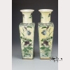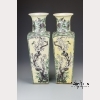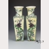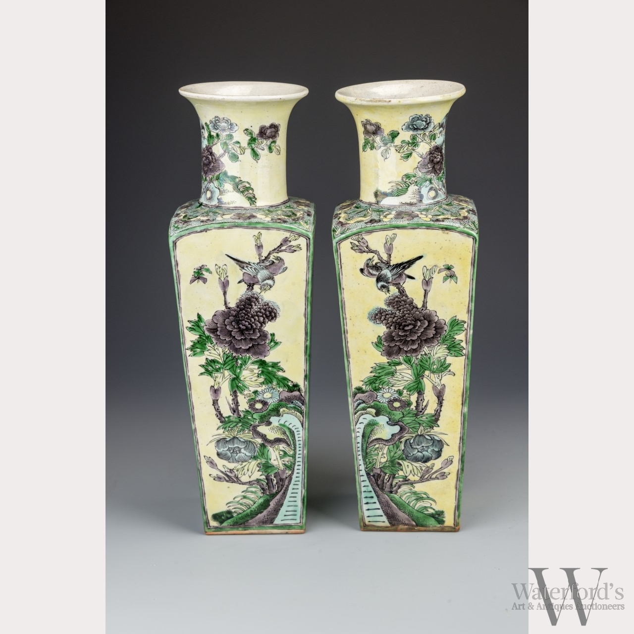 18th century, Kangxi period, Qing dynasty. Porcelain four-sided baluster vases with round flaring necks, decorated in famille jaune overglaze enamels to depict birds amidst the flowers of the four seasons on each of the four sides: prunus (winter), peony (spring), lotus (summer), and chrysanthemum (autumn). The shoulder decorated with a pattern of butterflies, prunus flowers, and bamboo; a rock, peonies and two birds around the neck. Bases drilled. Approx. 13 3/4 by 4 1/4 in., 35 by 11 cm.
