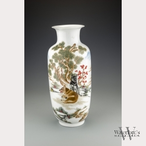 1962. Mao Era, People�s Republic of China. The tall rouleau vase painted on one side in polychrome overglaze enamels to depict two dogs, black and brown, beneath a pine tree in a landscape. En verso lithopane of Chairman Mao Zedong with a poem he wrote in the autumn of 1929 and published in 1962 titled �The Warlords Clash,� appearing to be written in his own calligraphic script style. Interior of the vase imprinted with a blue National Emblem of the People�s Republic of China. Red overglaze marks to base �Zhong Nanhai Huairen tang, zhenpin, Taoci Yanjiusuo, yi jiu liu er nian, jing zhi� or Treasure of the Huairen Hall of Zhongnanhai [palace adjacent the Forbidden City in Beijing to house the leaders of the Chinese Communist Party], respectfully made in 1962 by the Ceramics Research Institute [Jingdezhen].