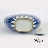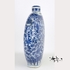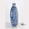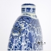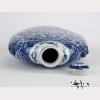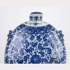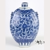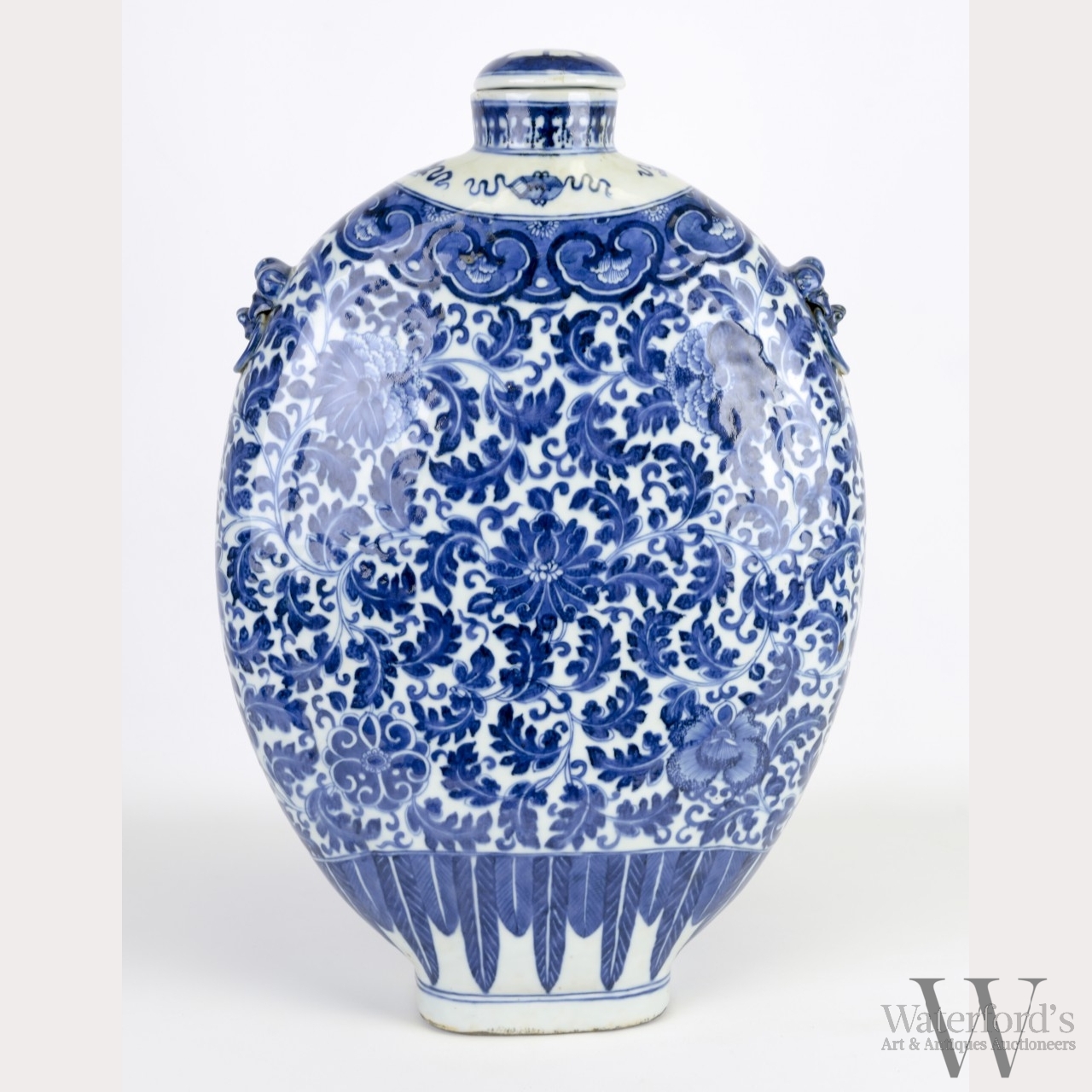 18th century, Qing Dynasty. The large flask of consisting of a flattened ovoid body with articulated sides, on a tall rectangular foot ring with narrow neck and domed cover, decorated in underglaze blue to depict lotus flower meander on the body between ruyi head and lappet borders, the shoulders with applied animal-head and ring handles. Approx. 19 � by 13 in., 50.2 by 33 cm.