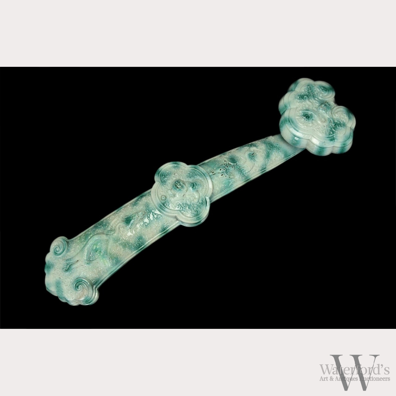 Late 19th century, Guangxu period, Qing dynasty. The heavily cast porcelain scepter, finely detailed, molded with a dragon amid clouds on the lingzhi shaped head, the handle with a quatrefoil center molded with a fu dog, with a crane above and dragon below, the scepter glazed in green and white in emulation of jadeite. Approx. 19 by 5 � in., 48.3 by 13.3 cm.