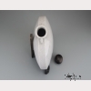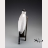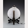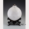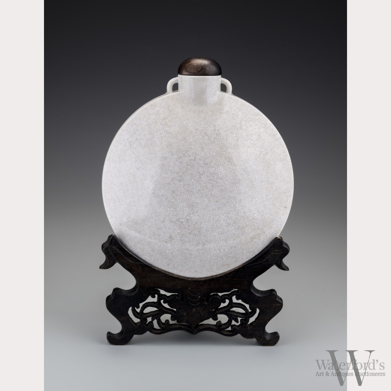 18th century, Qing dynasty. The flattened gently curving round flask with a short oval neck and two opposing "C" shaped handles, covered in a creamy white ge glaze with a very fine crackle network. With a dark hardwood oval domed cover and a carved and reticulated dark hardwood stand. Approx. 8 by 7 1/2 in., 20.3 by 19 cm.