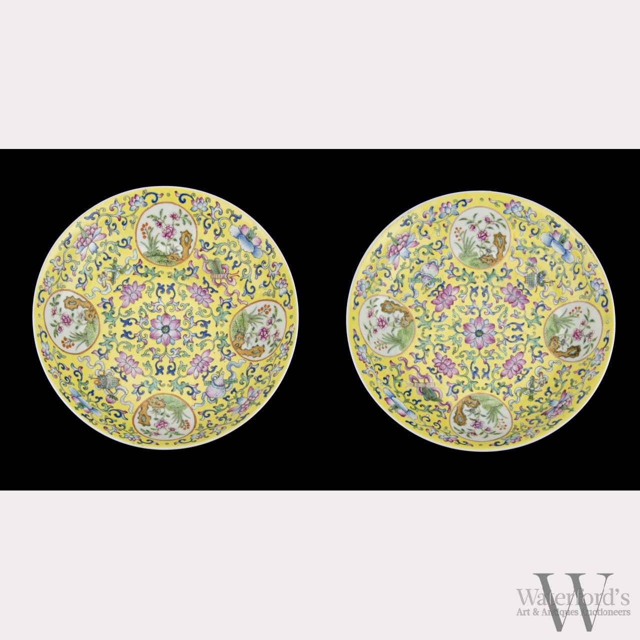 19th century, Daoguang period, Qing dynasty. The pair of wide round bottom dishes on foot rings decorated with famille jaune overglaze enamels to depict four roundels with lake Tai rocks, peonies, and lingzhi fungi, surrounded by lotus meander and auspicious objects against a yellow ground. The exterior decorated with five iron red bats. Four character iron red "shen de tang zhi" or "hall of prudent virtue" marks to bases. The hall of prudent virtue was completed in 1831 during emperor Daoguang's reign. Approx. 1 7/8 by 8 7/8 in. diam., 4.8 by 22.5 cm. diam.